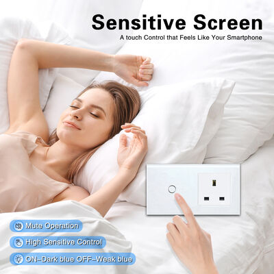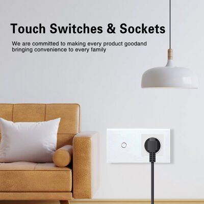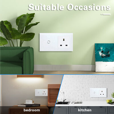 Premium 146*86*35mm glass panel touch switch and socket combination featuring fireproof 94V0 plastic construction. Designed for residential use in UK, Middle East, and African markets.